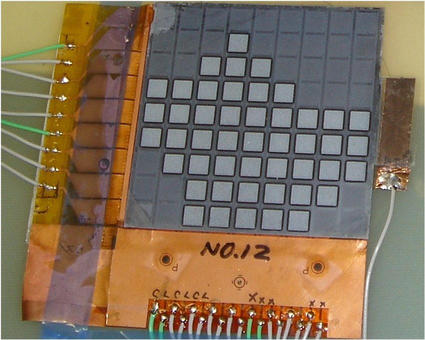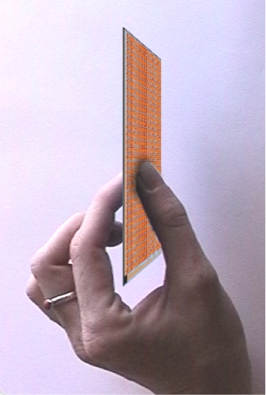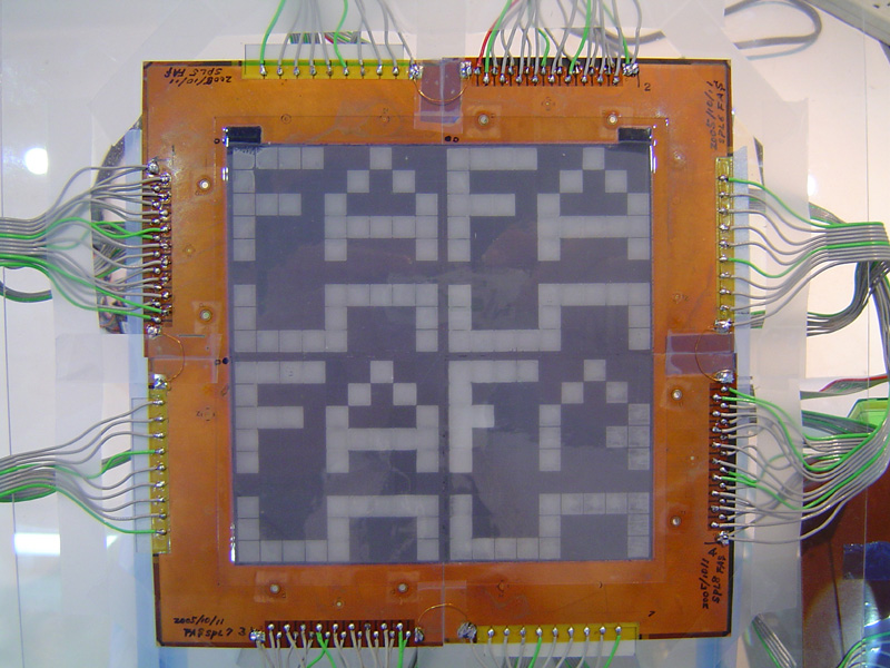 To help you understand the basics of our technology, you may view this animated PowerPoint presentation or the same thing in a non-animated .pdf file. Slide 14 demonstrates FASwitch working with the E Ink technology and we were working for a Kindle-like device as seen on slide 21. In the following pictures and videos, you will see squares that change color from dark to light and back. That is the E Ink material being turned on and off by our FASwitch switch array.