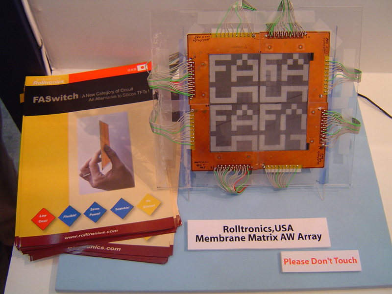 The FASwitch technology was highlighted at this flat panel display trade show. As a result of this trade show and ongoing efforts by our Japanese development team, Rolltronics Corporation attracted a good deal of attention by the Japanese display community. Later, after the FASwitch technology was licensed by Seertech Corporation, Seertech was successful in entering into a joint development agreement (see these articles here and here) with Dai Nippon Printing (DNP), the world's largest printing company, a major player in the display world and one of Japan's largest companies. Click on each picture for a larger view.